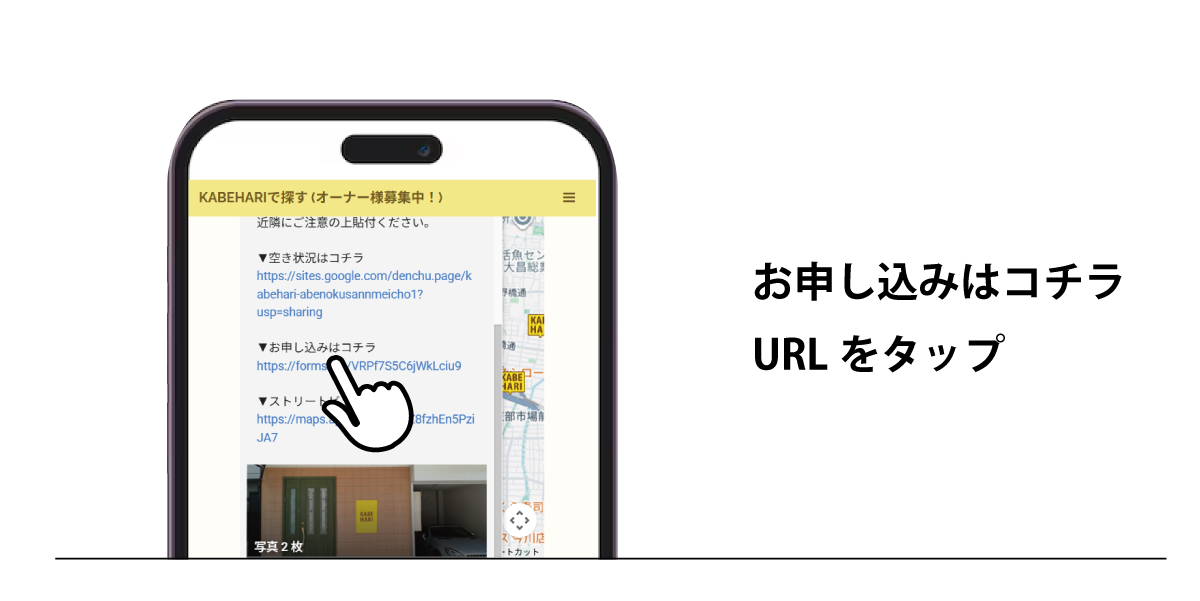 KABEHARIは、壁面を誰でも広告スペース(ポスター貼付場所)として貸し借りできる、 シェアリングサービスです。 個人宅や事業所などの物件所有者(オーナー)が、 ポスター貼付に壁面を利用したい方(ユーザー)に提供します。 KABEHARIが壁面の登録・掲載を行い、利用されるとKABEHARIからオーナーに、手数料30%を差し引いた掲載料が支払われます。