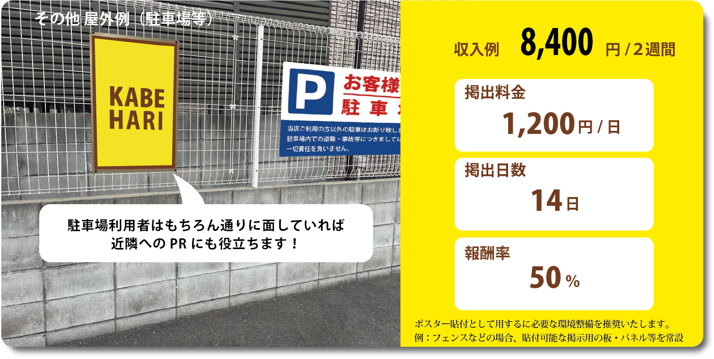 KABEHARIなら簡単に壁面スペースを収益化することができます。 もちろん、登録・MAP掲載料は無料で、設備も不要。
