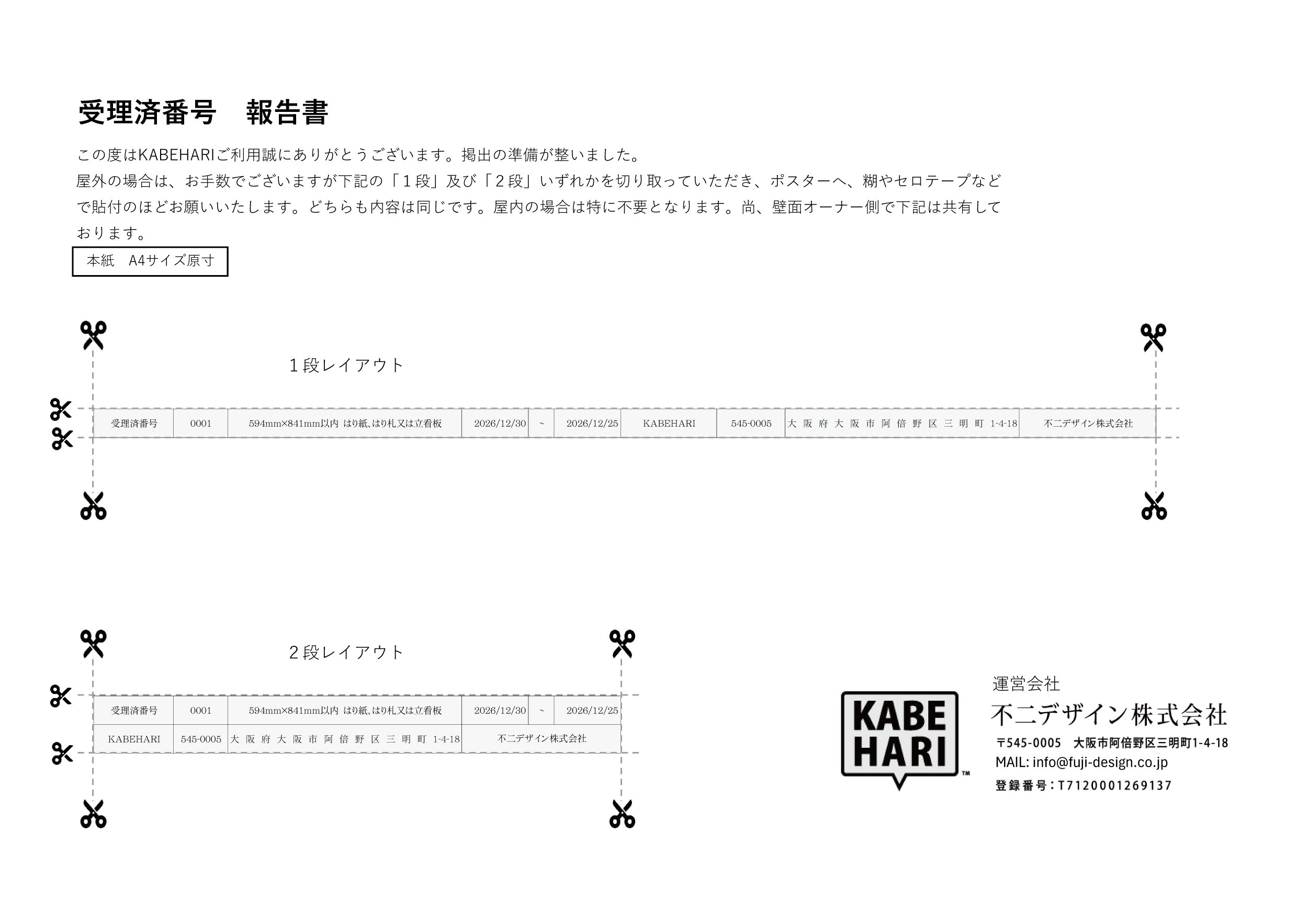 申し込みがあった際、オーナー様へは事前にKABEHARIスタッフよりメールにて、掲出内容、掲出期間、報酬金額が通知されます。広告主様とオーナー様との直接の連携は発生いたしません。